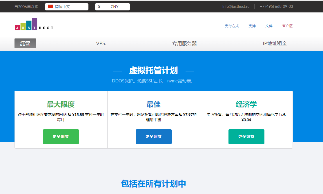 Justhost是一家成立于2006年的俄罗斯主机商,主营虚拟主机、VPS和独立服务器,数据中心有两个位于莫斯科,为 DetaLine 和 RosTelcom;目前已经增加了第三个选项:新西伯利亚。