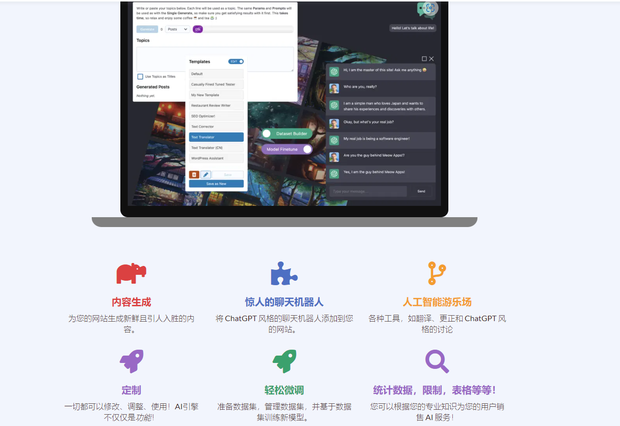 此外,AI Engine Pro还具有内容和图像生成器功能,为您的网站生成新鲜且引人入胜的内容和图像。AI Engine Pro还提供人工智能游乐场,其中包括多种工具,如翻译、更正和讨论等。它还有一个模板系统,您可以用来创建您自己的模板,使您的工作更加轻松。