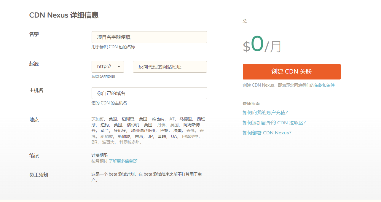 按需求填入你想要反向代理的站点,输入完点击创建/Create CDN Nexus